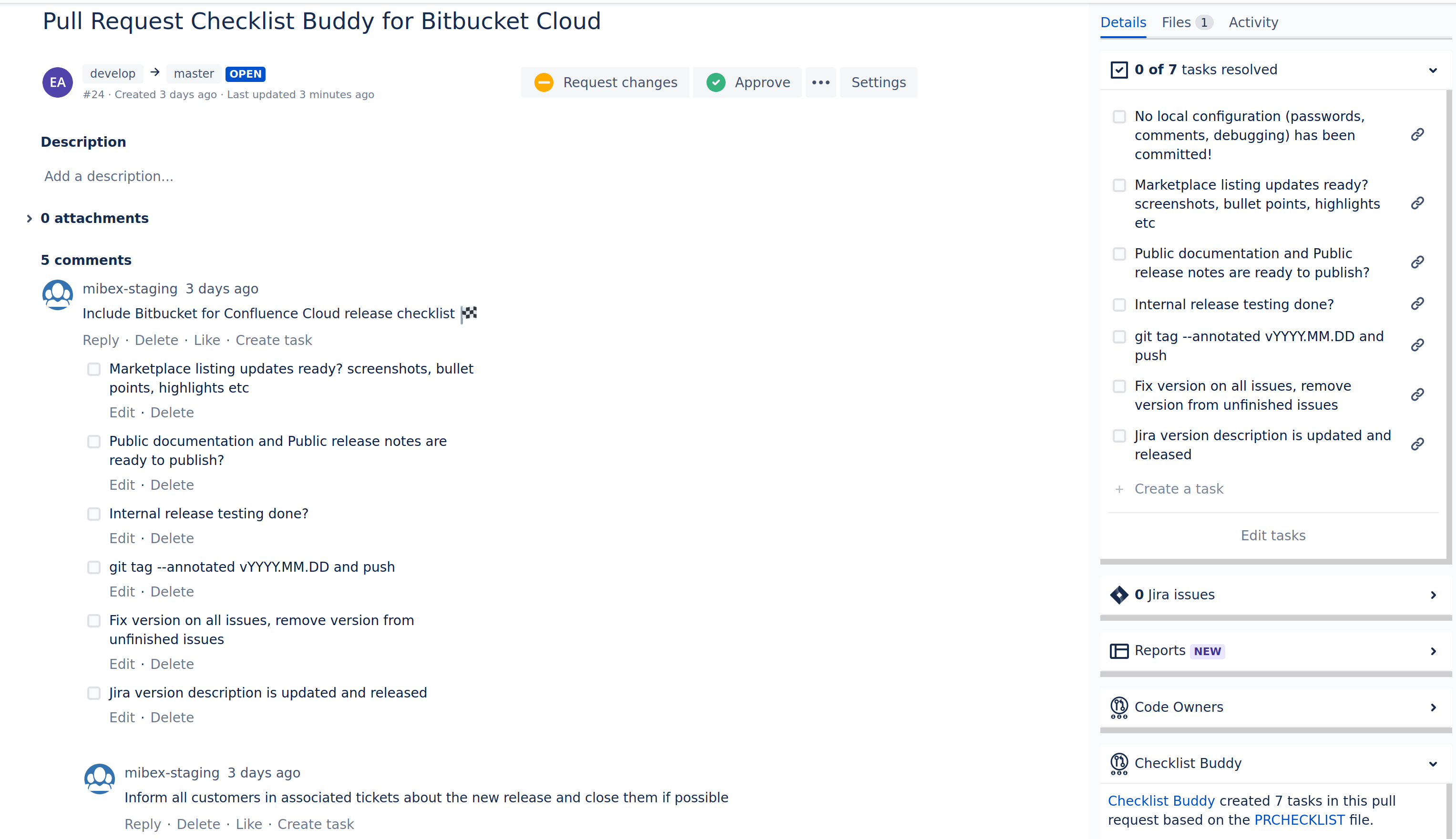 OPTIONAL: To enforce resolving the tasks in the checklists, enable the merge check No incomplete tasks (Bitbucket DC) or No unresolved pull request tasks (Bitbucket Cloud).