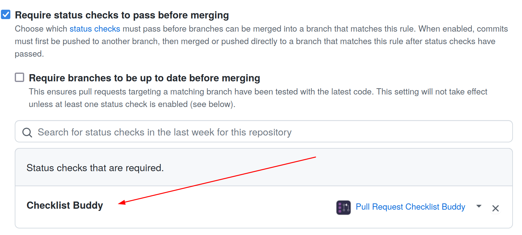 PRCHECKLISTin the root folder of your git repository. The file should include as content a simple task, like:+task+ Hug your Checklist Buddy once a day.This will help you run a test to ensure the initial setup was successful. You will later be able to customize this file to add all the tasks, checklists and comments you want for your pull requests.