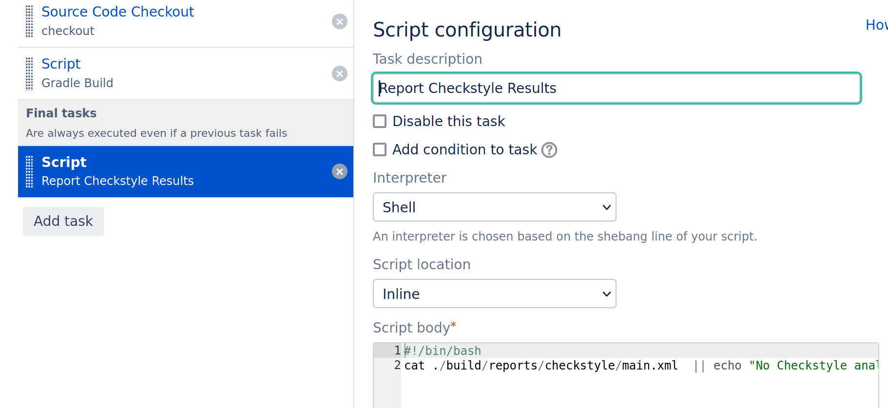 To show Checkstyle analysis results, print the Checkstyle result XML to the build log.