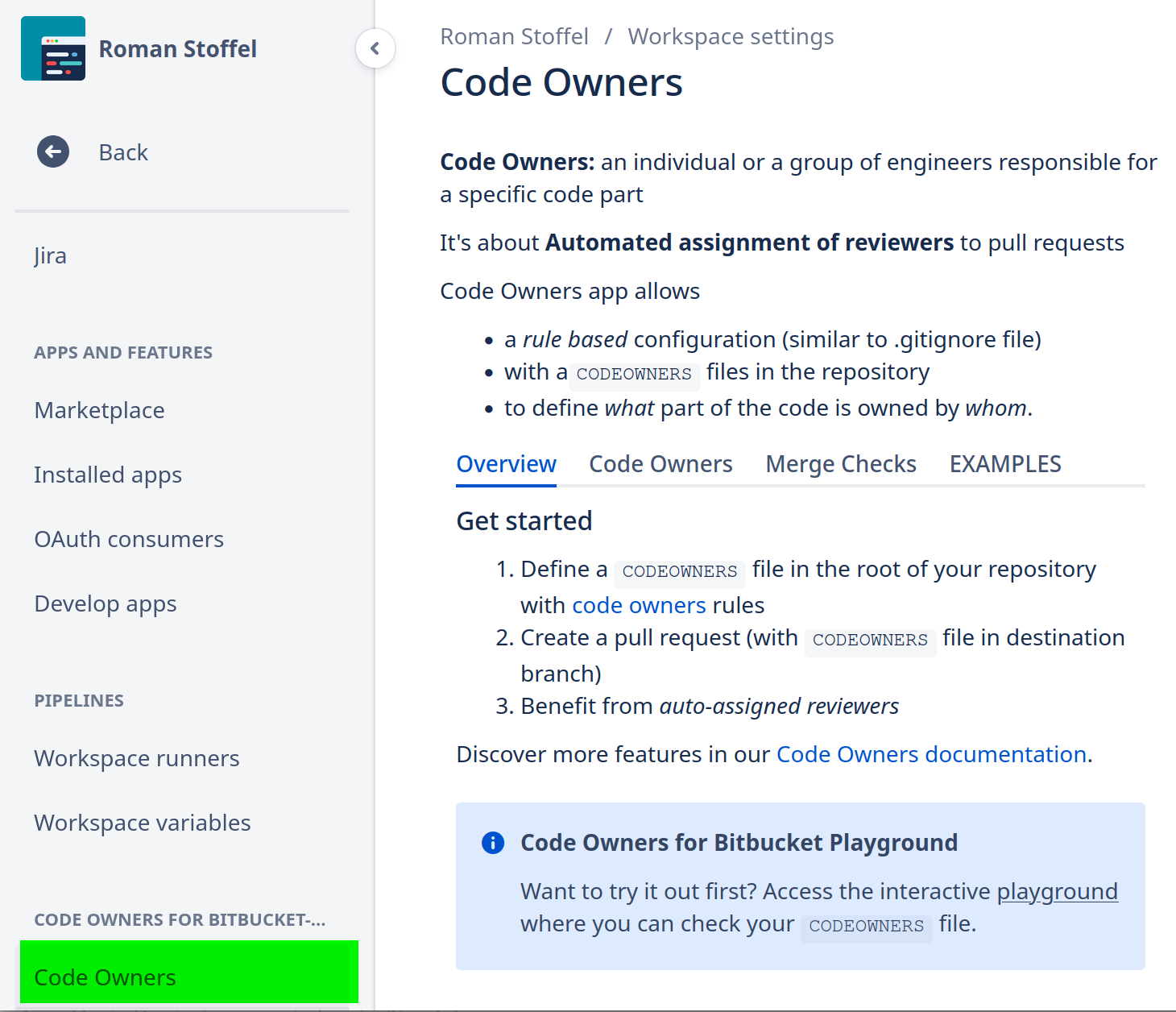 In the Bitbucket Admin section, there is now a Code Owners section with documentation about CODEOWNERS files: