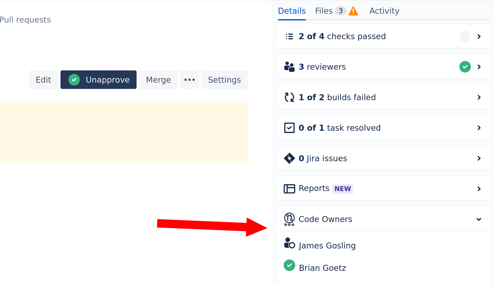 The following screenshot shows the assigned Code Owners of the pull request including their approval status:
