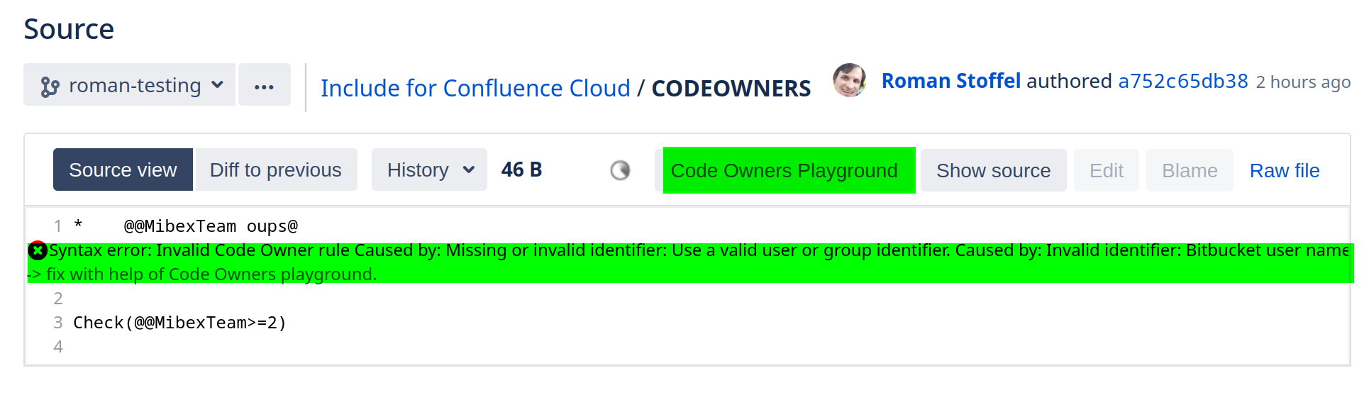 Errors in the CODEOWNERS syntax are now shown in Bitbucket.