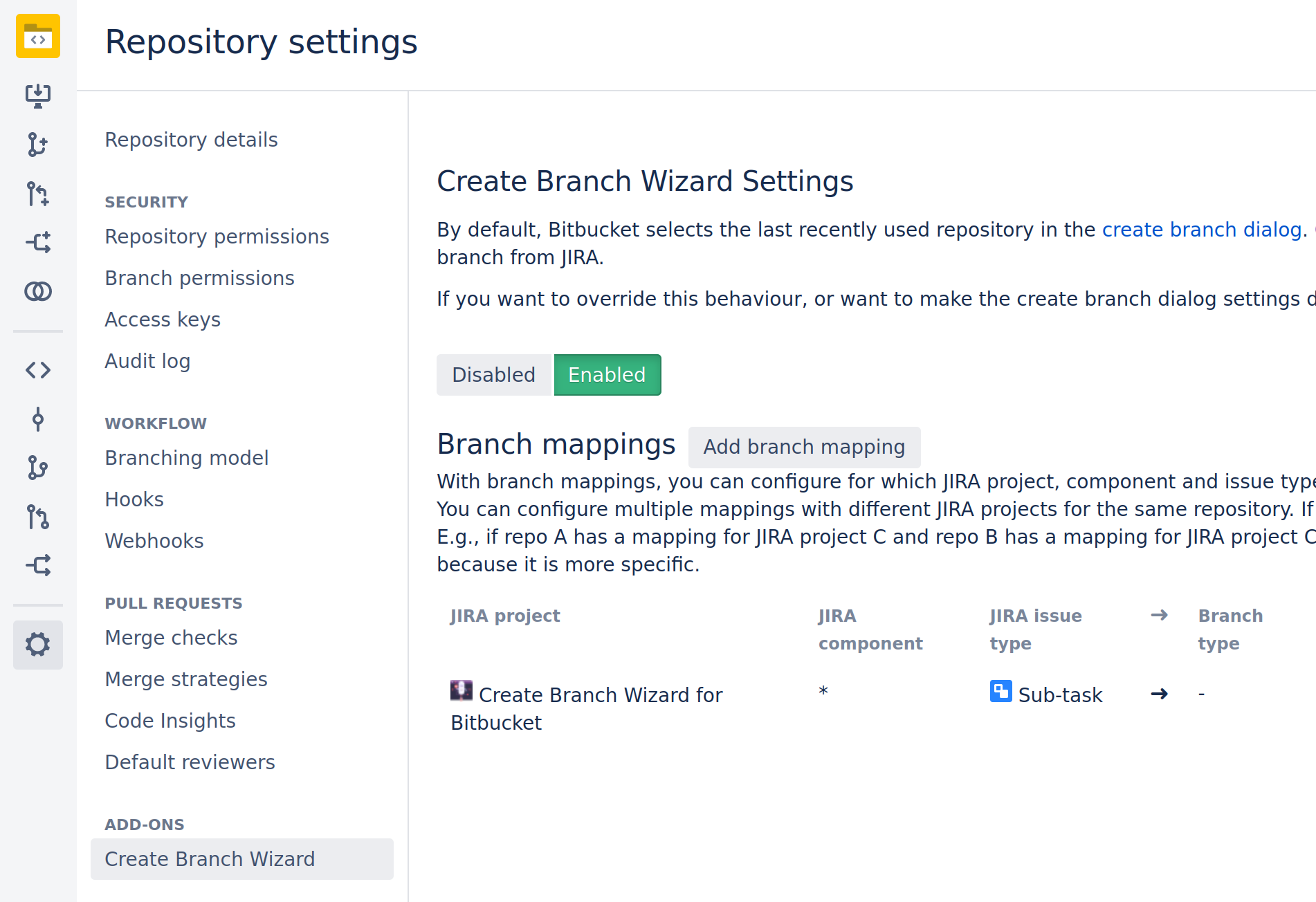 If you want to override this default behavior or want to make the create branch page settings dependent on other factors like the JIRA component of the issue, you can define so-called branch mappings.