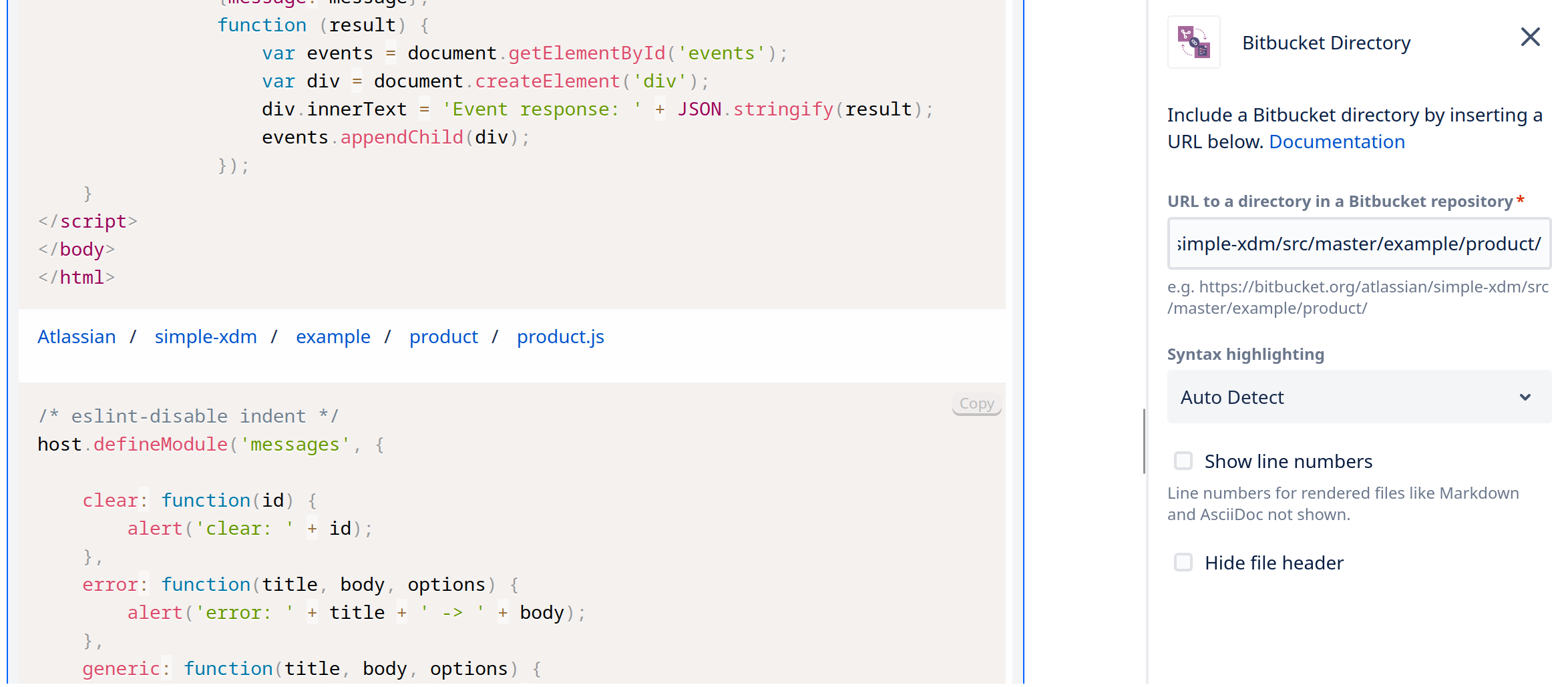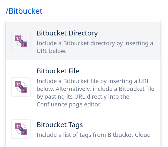 You can now include all files in a directory at once with the new Bitbucket Directory macro. Include your configuration files, REST API docs and other documentation directories from Bitbucket to share with your team.