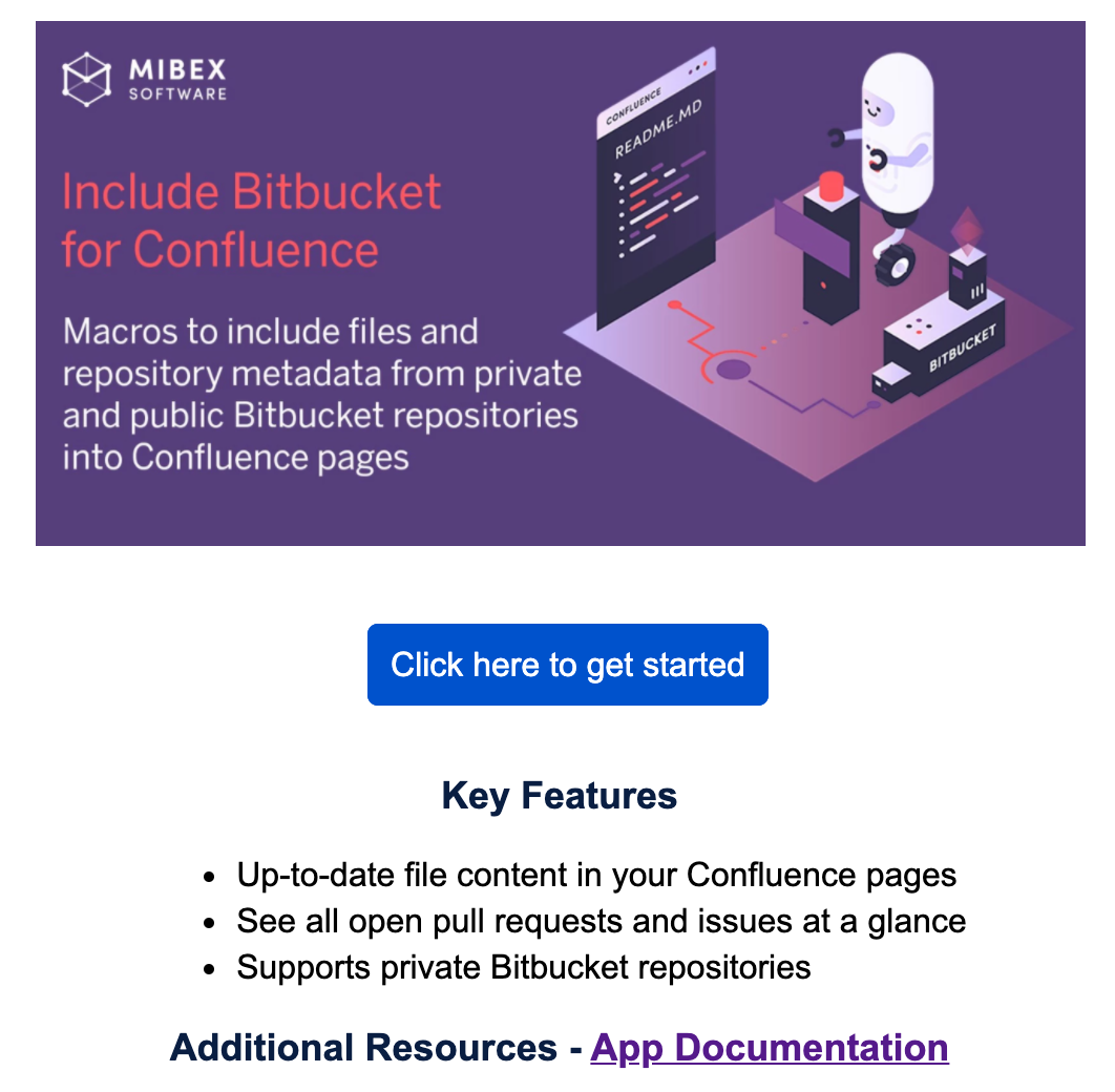 We want to make sure that installing Include Bitbucket is as seamless as possible so we have added a “Get Started” menu option which includes a link to helpful information including documentation, key features and set up steps. It’s never been easier to get started with Include Bitbucket!