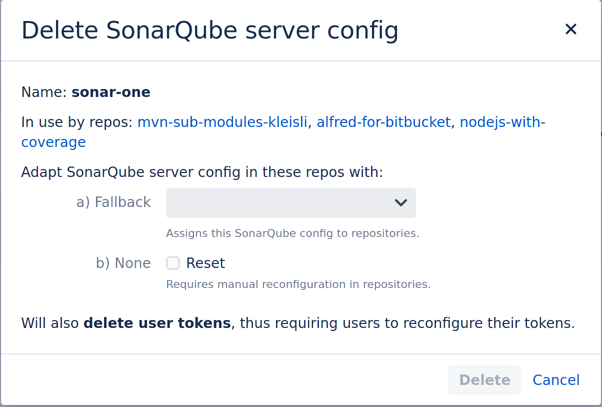 When you delete a SonarQube server configuration, you can now select how you want to deal with Bitbucket repositories still using this server configuration: