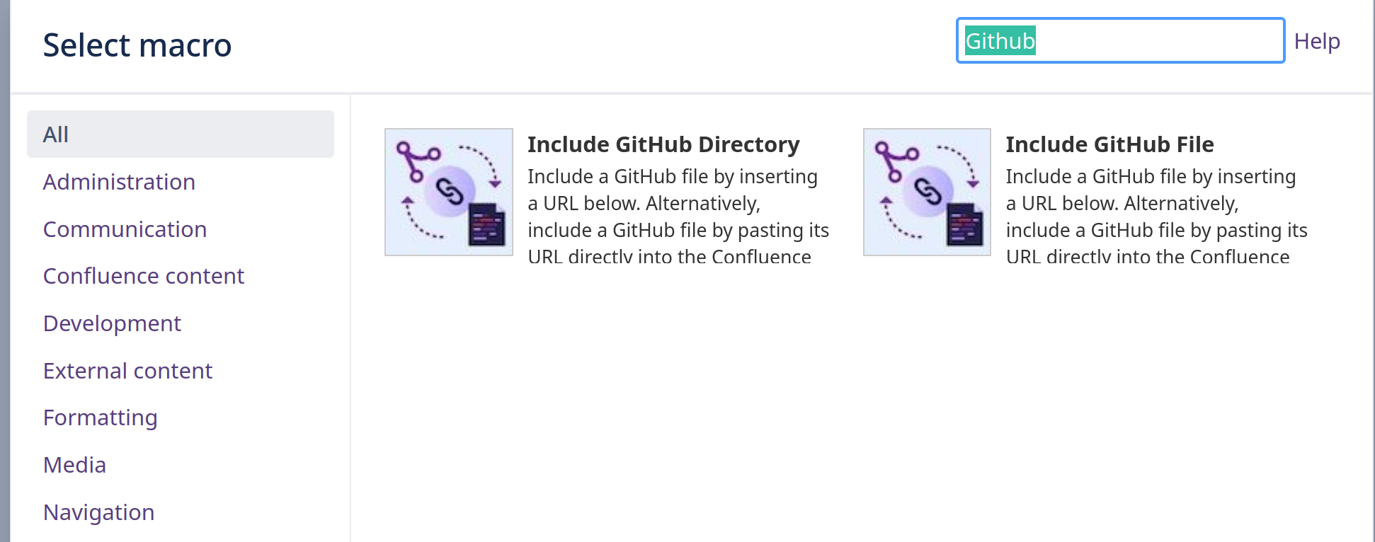You can now include all files in a directory at once with the new GitHub Directory macro. Include your configuration files, REST API docs and other documentation directories from GitHub to share with your team.
