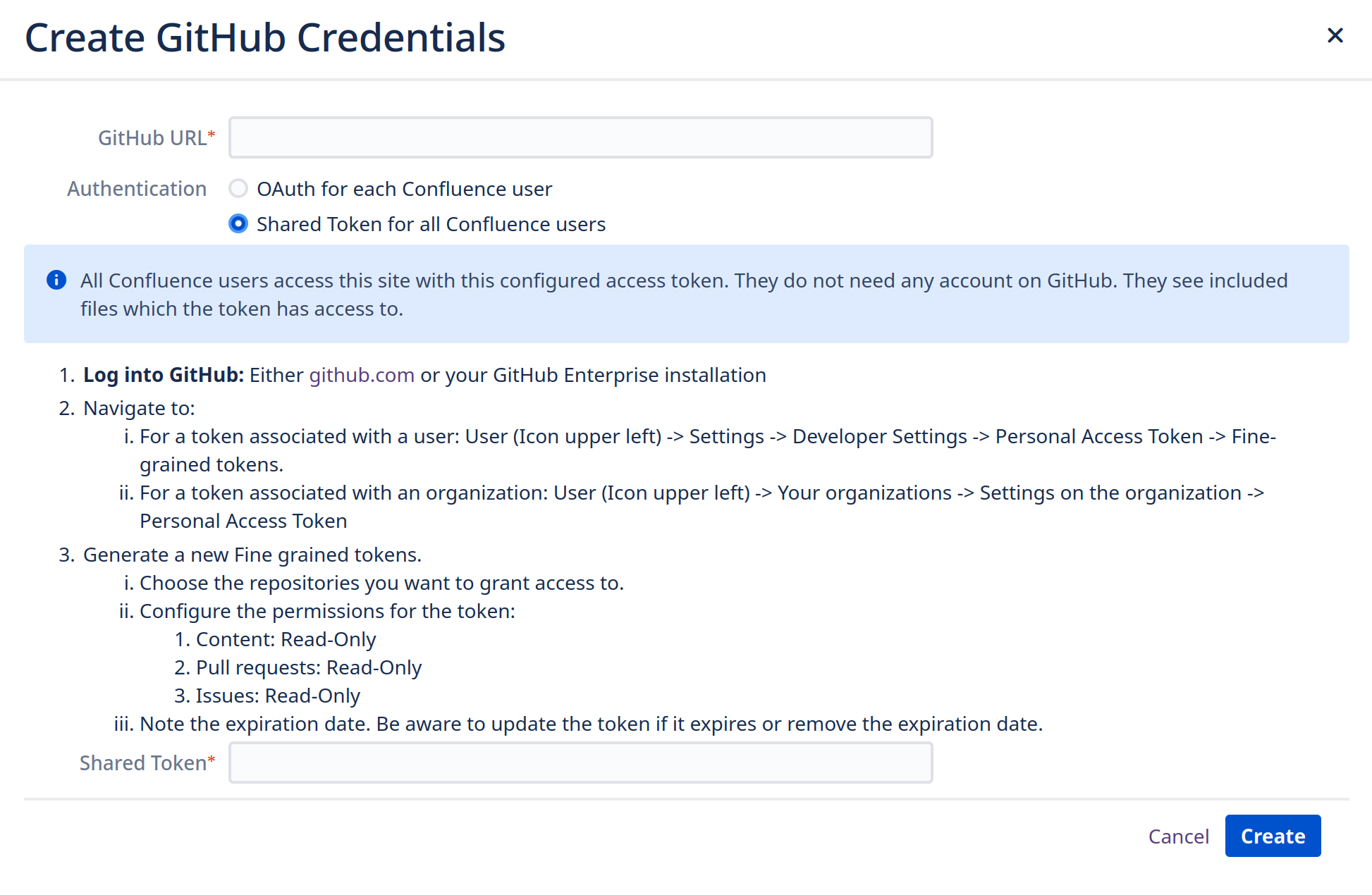 By default Include GitHub for Confluence uses personal OAuth to access private repositories. This ensures that each Confluence user can only access private repositories that they have access to, but requires a that each user has a GitHub account.