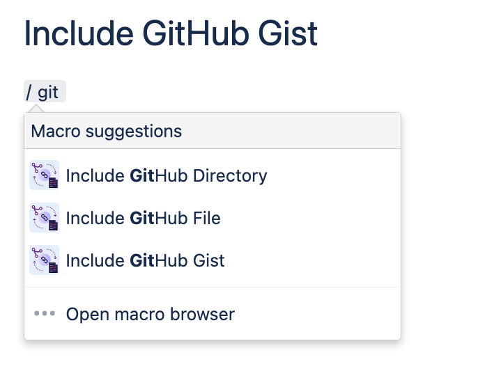 / Include GitHub GistandENTERto add and edit the macro, orclick in the editor toolbar on Insert > Other Macros and select the Include GitHub Gist macro (located in the category “External Content” of the macro library).