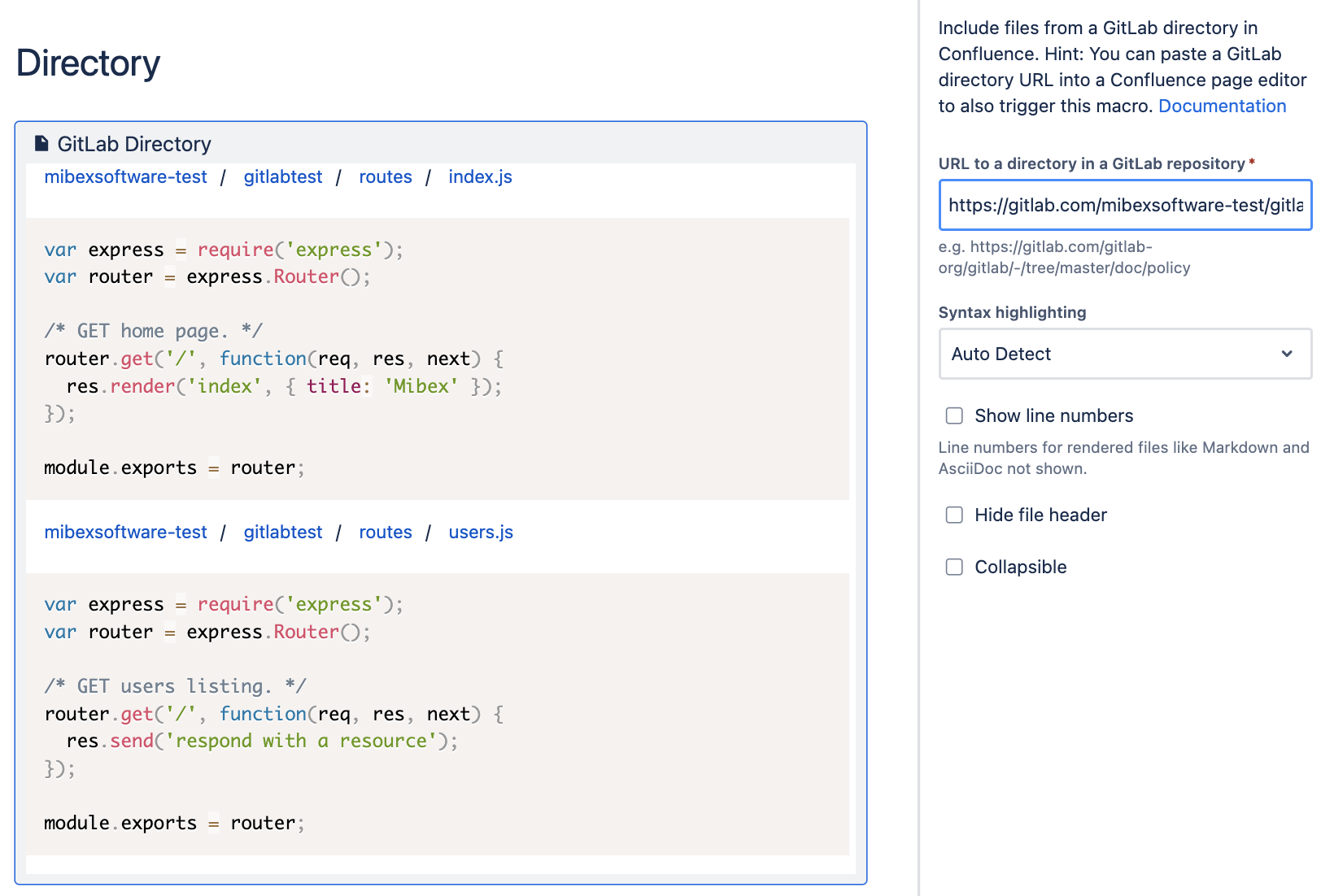 You can include at once all the files of a specific directory (folder) from a GitLab repository in your Confluence page.