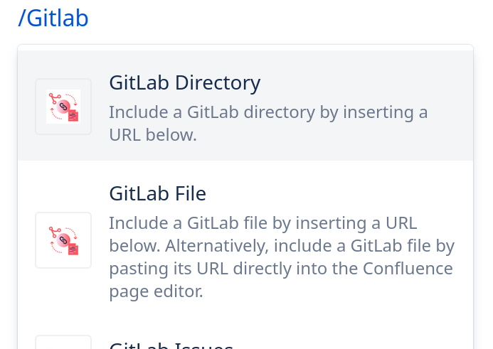 /GitLab DirectoryandENTERto add and edit the macro.using the Insert button from the editor toolbar and then picking the GitLab Directory macro from the “External Content” category of the macro library.