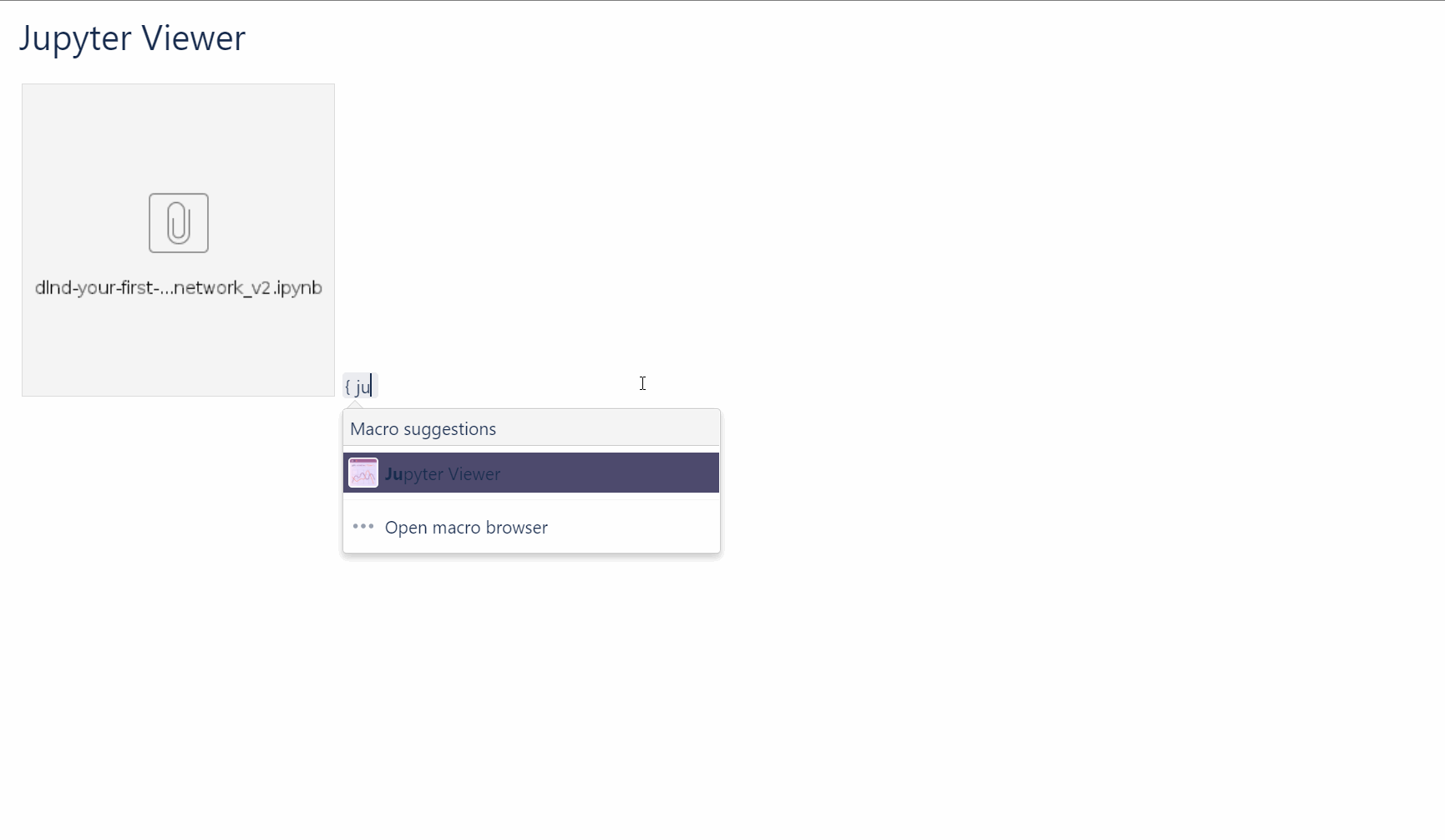 {Jupyter Viewer for ConfluenceandENTERto add and edit the macro. Alternatively you can pick the Jupyter Viewer for Confluence macro from the macro browser.Add the